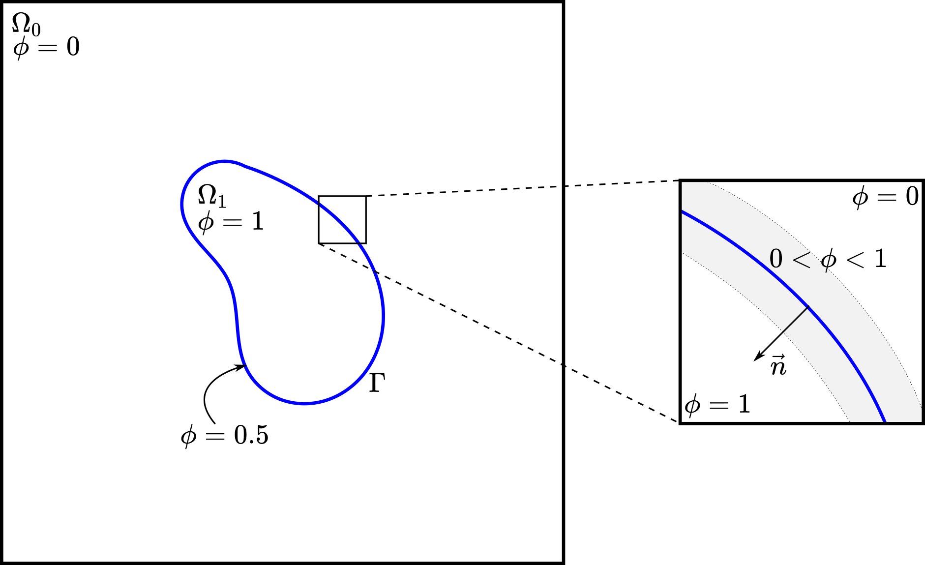 This phase indicator changes rapidly but smoothly from \(0\) to \(1\) at the interface such that \(\Gamma\) is located at the iso-contour \(\phi=0.5\), as illustrated below.